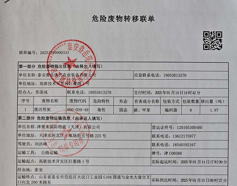 泰安鲁岳现代农业装备有限公司认真贯彻执行环保法规和上级领导的正确指示,依法处置生产对环境造成的影响。公司已与“宁阳青山物流有限公司”、“山东华益环保科技有限公司...