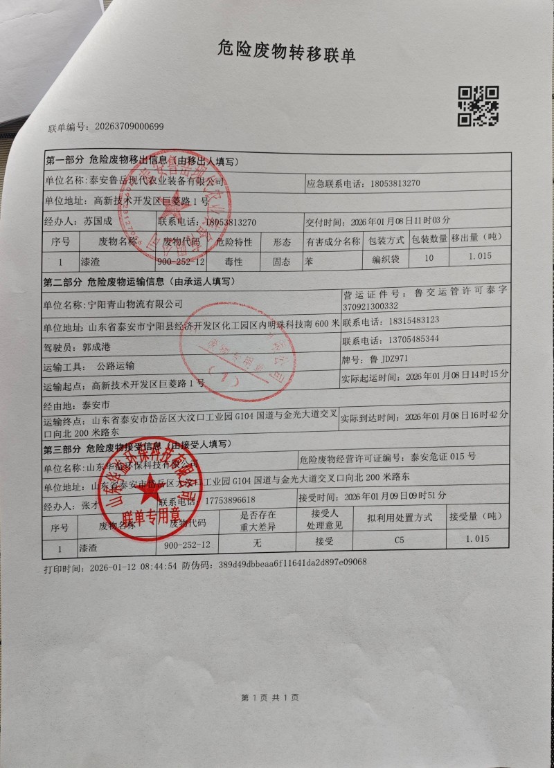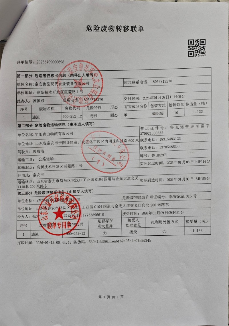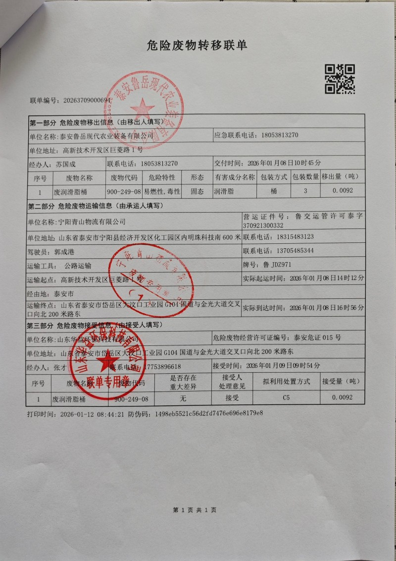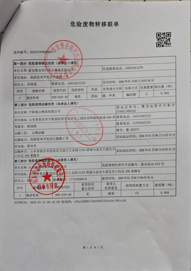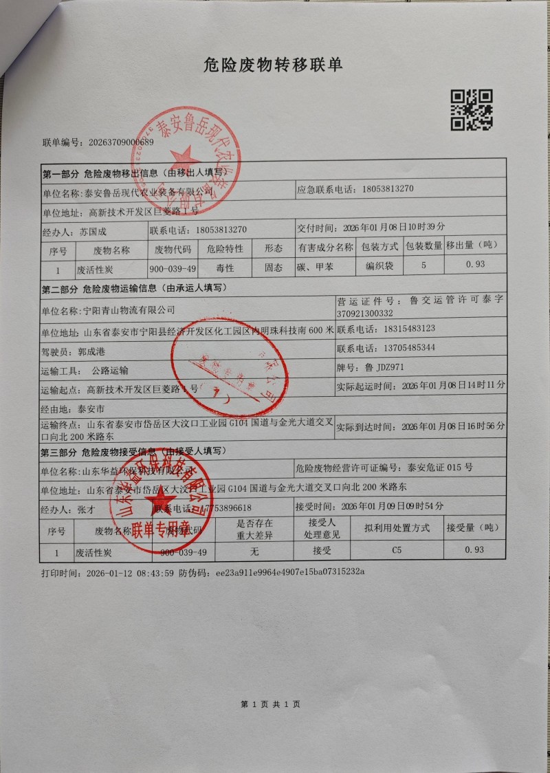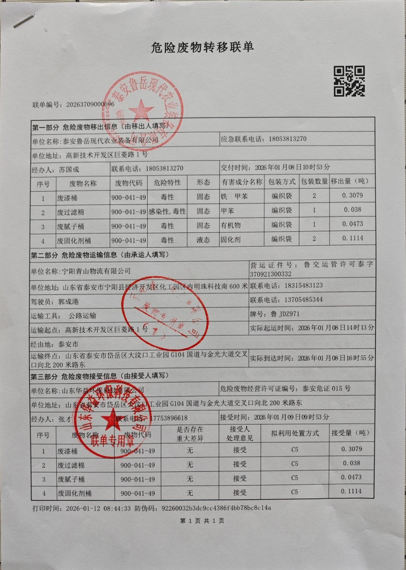 公司已与“宁阳青山物流有限公司”、“山东华益环保科技有限公司”联合处理危废共计7种,共4.5808吨。危废转移联单参见附件。